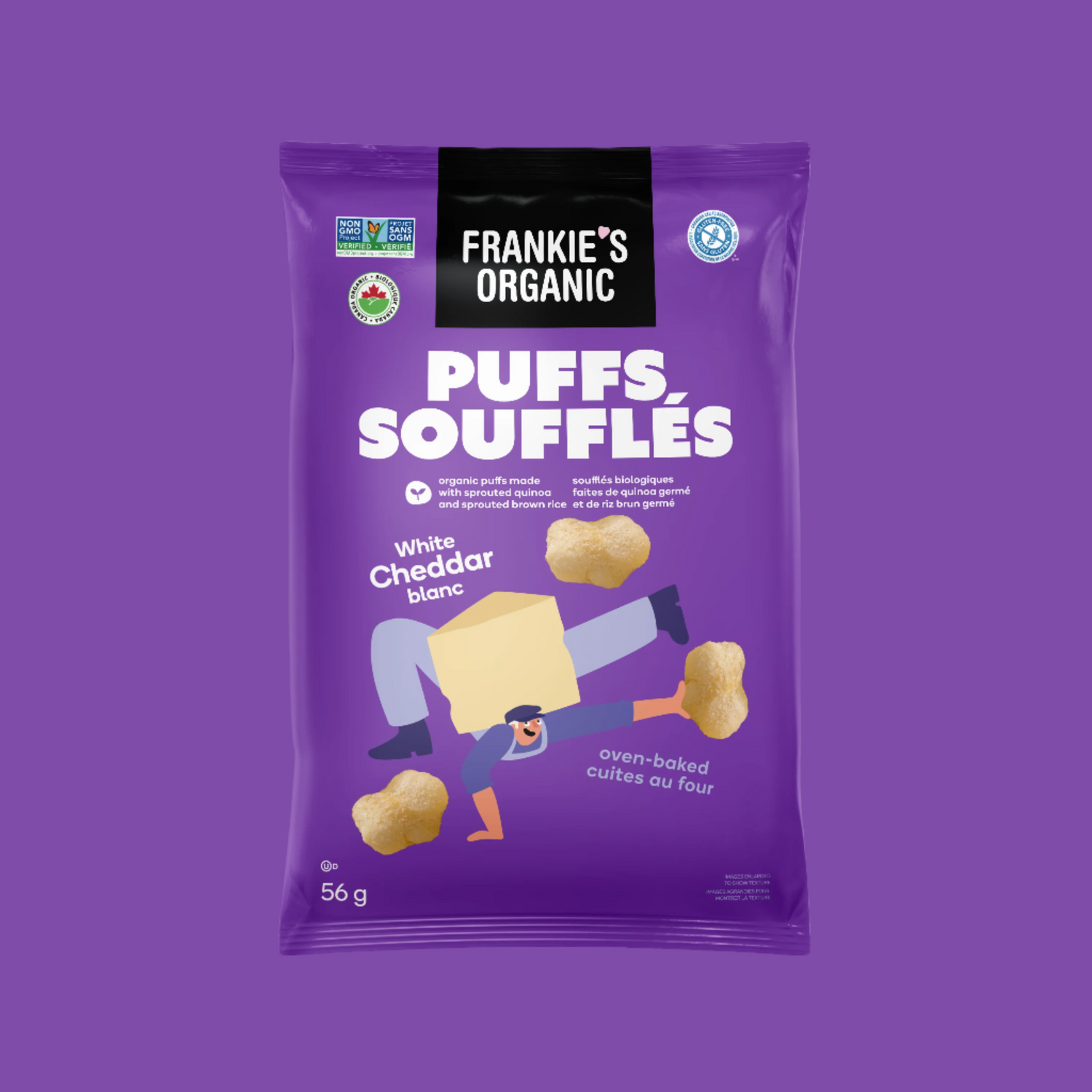 Les Soufflés au cheddar blanc de Frankie's offrent un bon goût de fromage. Ils sont légers et croquants avec un goût de cheddar fort satisfaisant à chaque bouchée. Prenez-les comme collation – ou finissez le sac entier. Ces soufflés sans culpabilité sont faits avec des ingrédients bons pour la santé comme le quinoa germé et le riz brun germé. Ils sont également certifiés sans gluten sans compromis sur la saveur, ce qui en fait la collation parfaite pour tout le monde.